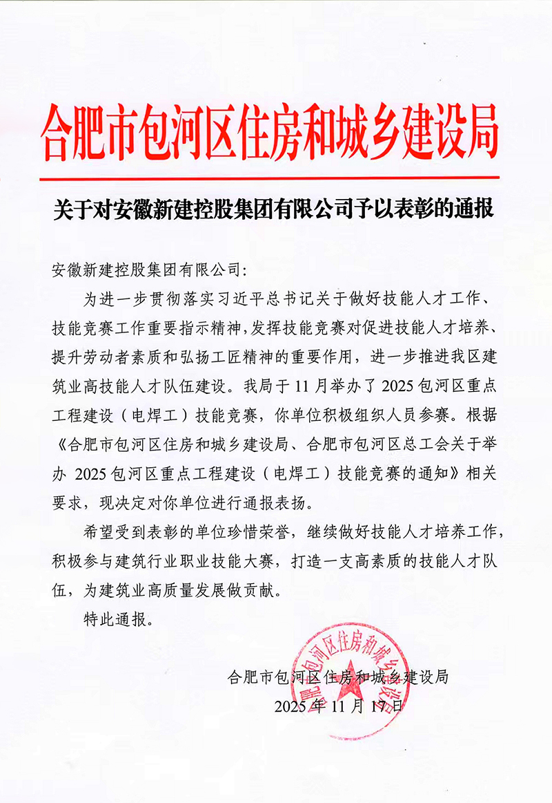 11月17日,从合肥市包河区住房和城乡建设局传来喜讯,我公司因在“2025包河区重点工程建设(电焊工)技能竞赛”中的出色组织和积极参与,获得主管部门通报表扬。这一荣誉是对我公司在技能人才培养和高素质队伍建设方面工作的充分肯定。