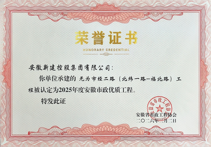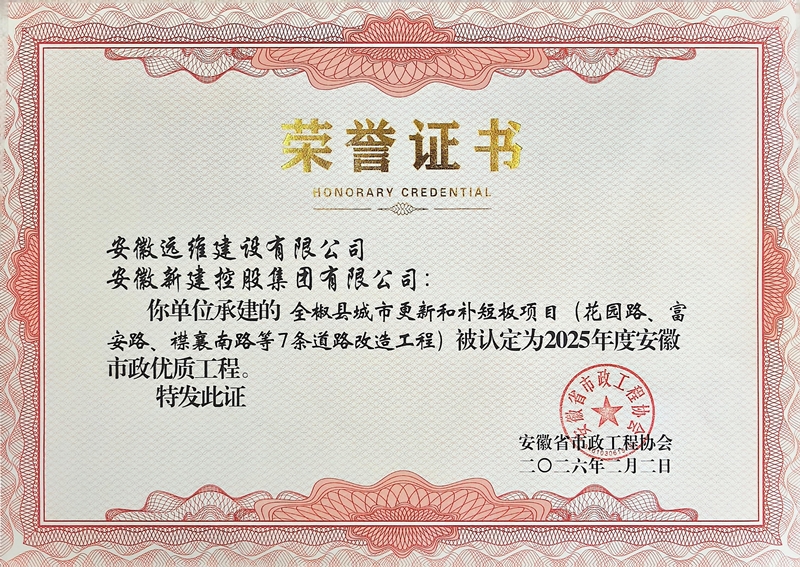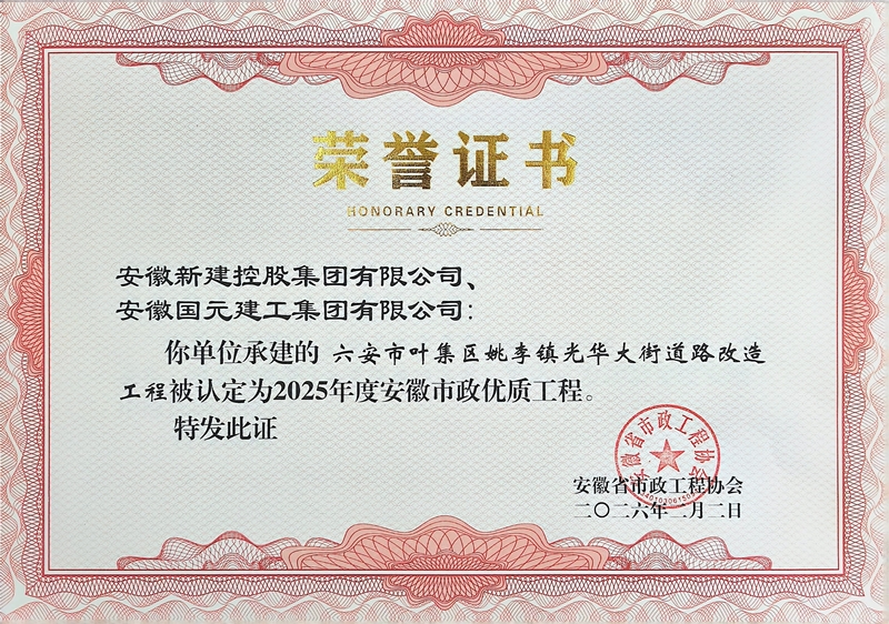 2月2日,安徽省市政工程协会公布2025年度安徽市政优质工程项目名单,集团公司承建的四项工程荣获奖项,分别是:六安市叶集区姚李镇光华大街道路改造工程、全椒县城市更新和补短板项目、叶集化工集中区市政道路配套工程、无为市经二路工程。