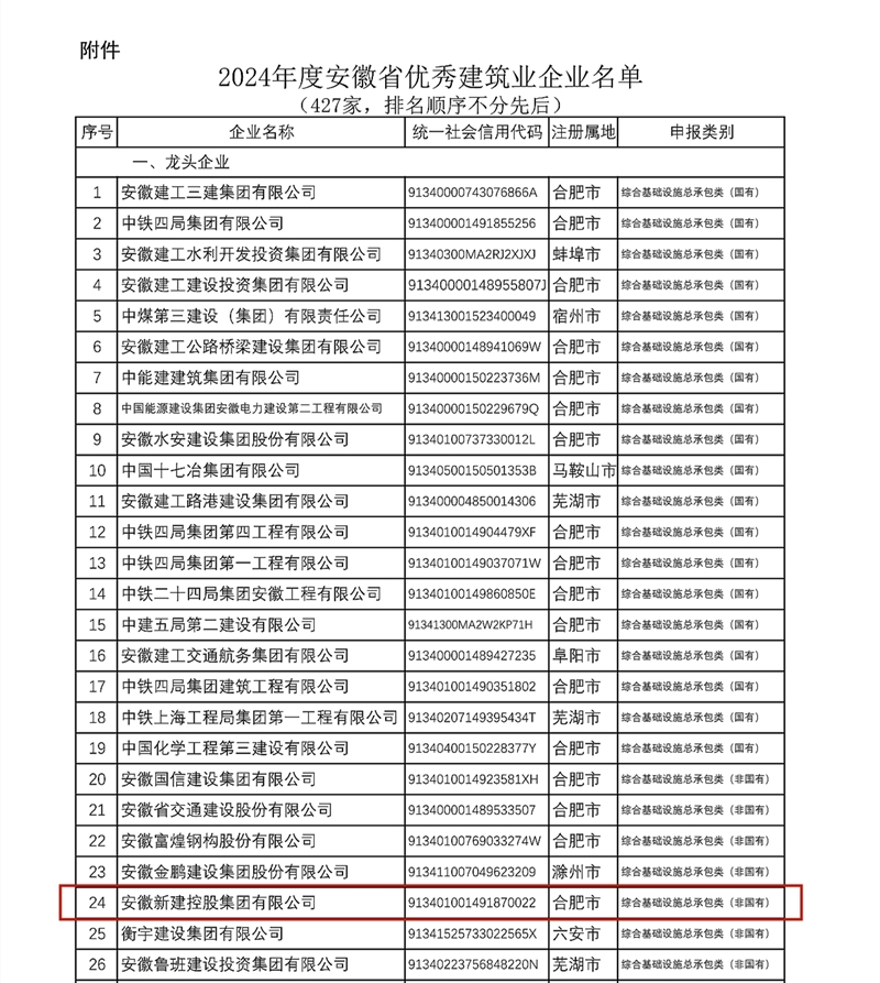 近日,安徽省住房和城乡建设厅、省交通运输厅、省水利厅、省通信管理局联合公布2024年度安徽省优秀建筑业企业认定结果,其中,新建集团凭借非凡实力,连续五年荣登榜单,并获评“综合基础设施总承包类龙头企业”称号!