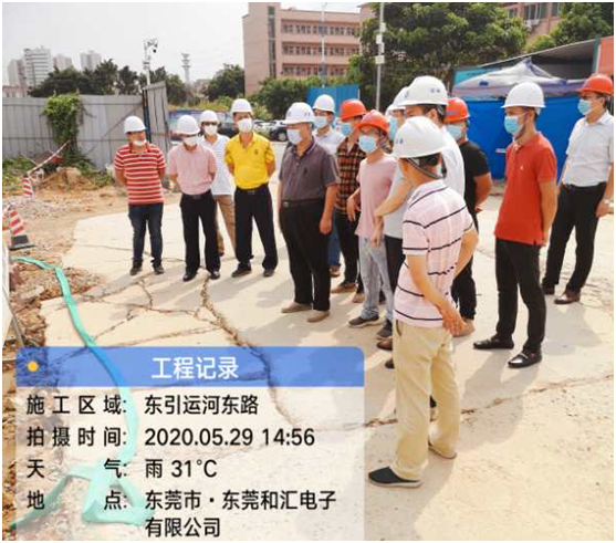2020年5月29日下午,东莞市水务局副局长肖清忠、市质监站站长卓俊浩、横沥镇人大主任吴灿枝、横沥镇重点办主任陈伟华等领导同志到我公司东莞职教城项目现场进行检查。