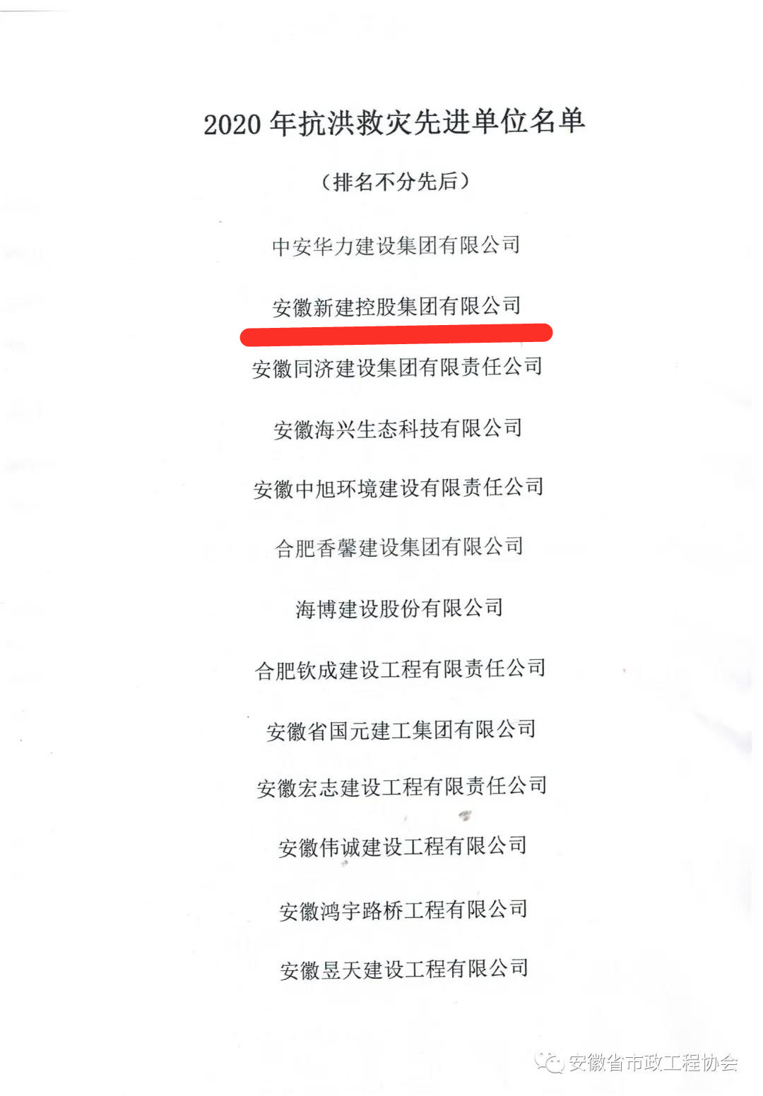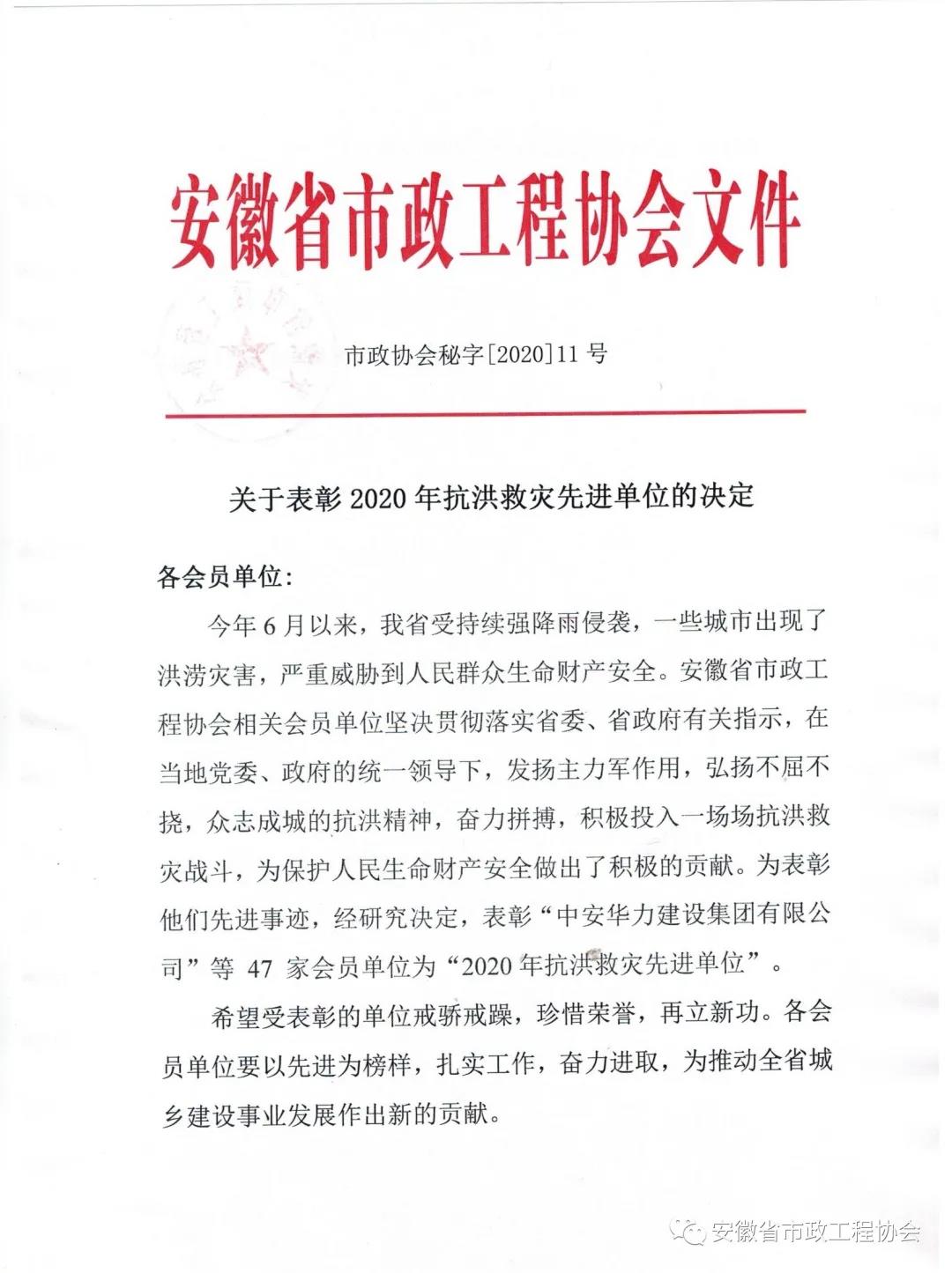 据悉,本次评比活动由安徽省市政工程协会组织,共有47家单位获评“2020年抗洪救灾先进单位”。