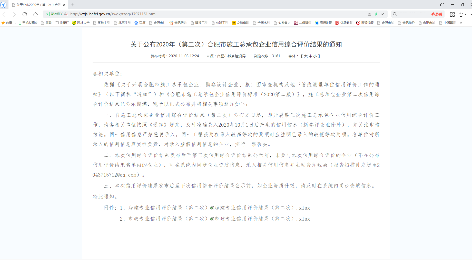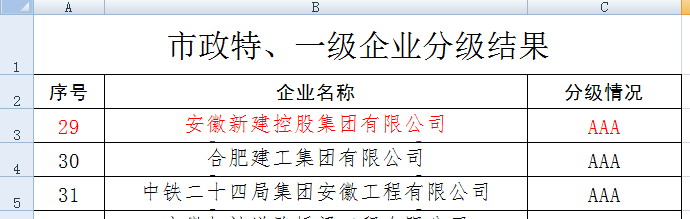 合肥市城乡建设局依据《关于开展合肥市施工总承包企业、勘察设计企业、施工图审查机构及地下管线测量单位信用评价工作的通知》和《合肥市施工总承包企业信用评价标准(2020第二版)》,合肥市城乡建设局2020年(第二次)合肥市施工总承包企业信用综合评价结果正式公布。安徽新建控股集团有限公司榜上有名,荣获2020 年(第二次)合肥市政专业3A级信用评级!