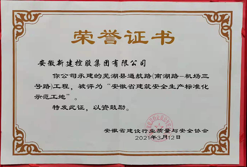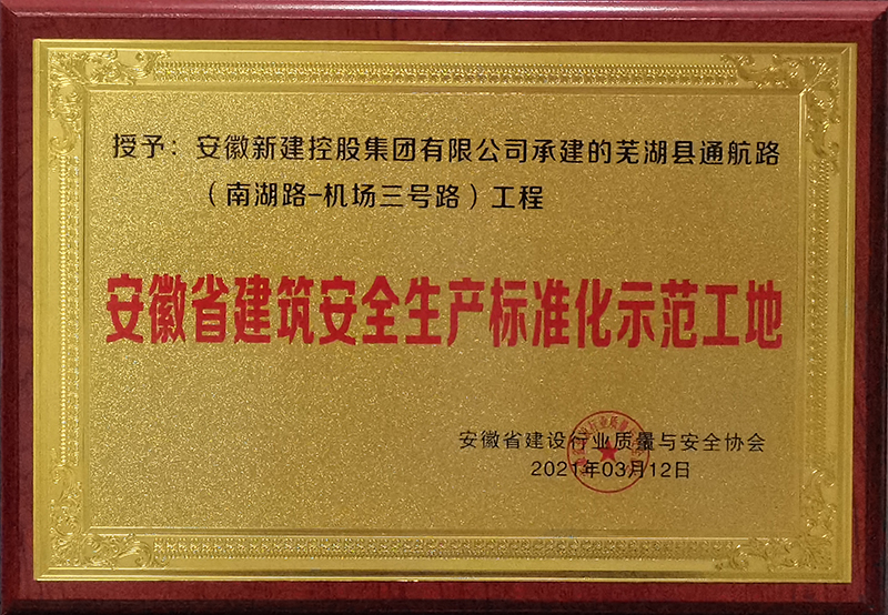 日前,安徽省建设行业安全协会公告2020年度第四批安徽省建筑安全生产标准化工地名单,由集团公司承建的芜湖县通航(南湖路-机场三号路)工程荣获”安徽省建筑安全生产标准化示范工地”称号。