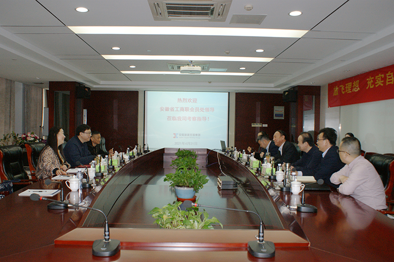 2021年4月21日上午,安徽省工商联会员处副处长张旭来我集团公司调研指导工作,安徽省城市基础设施投资商会副会长兼秘书长谢宏明、商会执行秘书长陈志武同行。