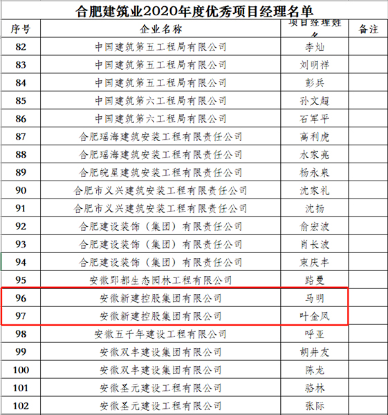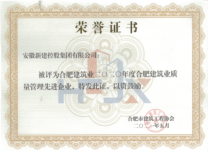 近日,合肥市建筑工程协会发布通知,合肥建筑业2020年度评优评先工作已全面完成,获奖单位颁发领取荣誉证书。安徽新建控股集团公司荣获合肥建筑业2020年度质量管理先进企业、合肥建筑业2020年度优秀施工企业等2项荣誉。同时,集团公司马明、叶金凤也被授予合肥建筑业2020年度优秀项目经理,丁康被授予合肥建筑业2020年度扬尘治理先进个人。
