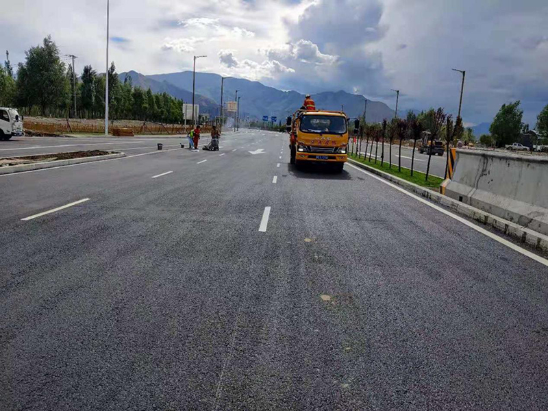 在施工过程中,项目部技术人员对施工班组进行详细的安全和技术交底,标线按设计要求使用热熔反光涂料,涂料中混合占总重 18~25%的玻璃微珠,在喷涂时标线表面均布 0.3~0.4kg/m2 的玻璃微珠,在试撒合格后正式开始施工,经一周紧锣密鼓的安排与施工人员的努力下,路面标线全面完成施工。