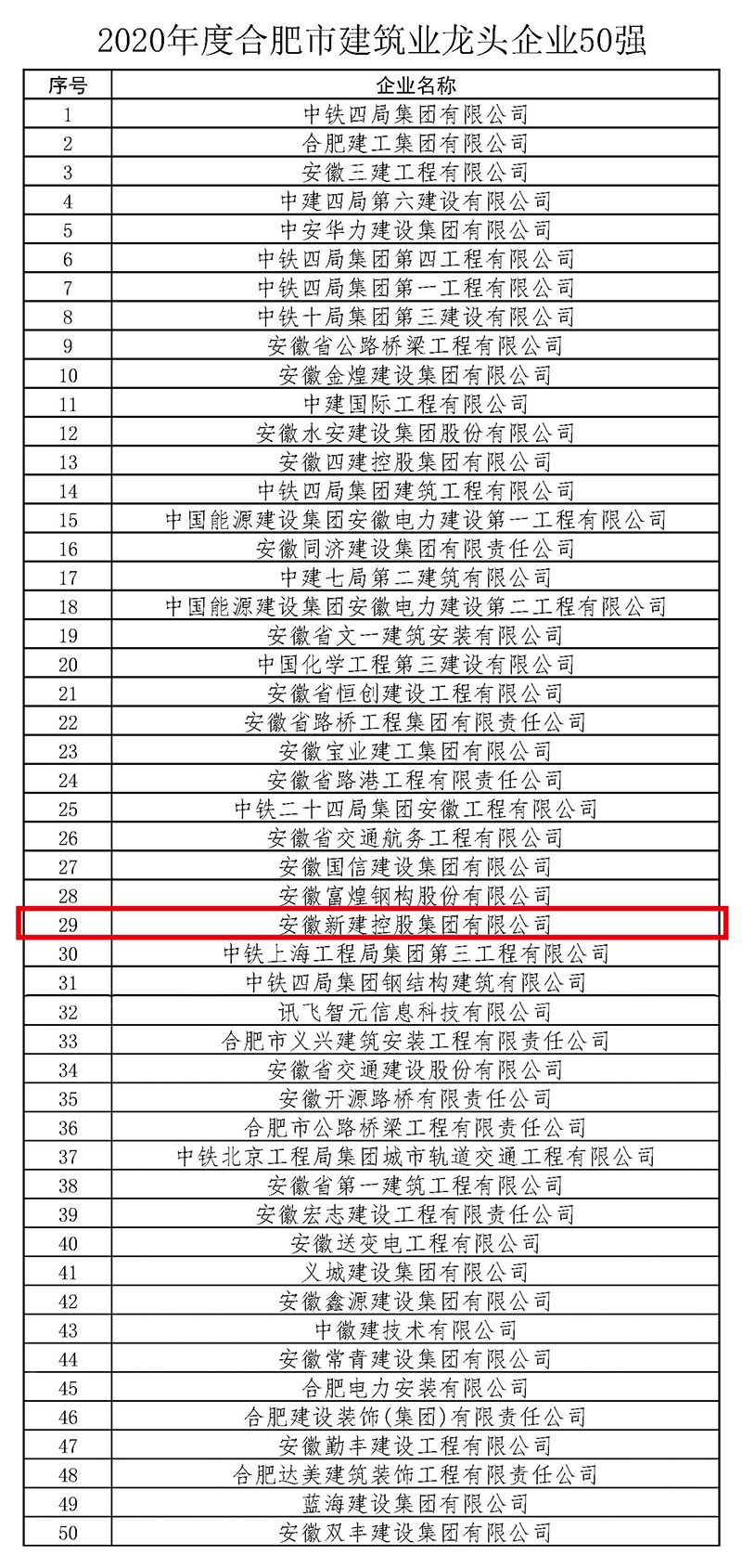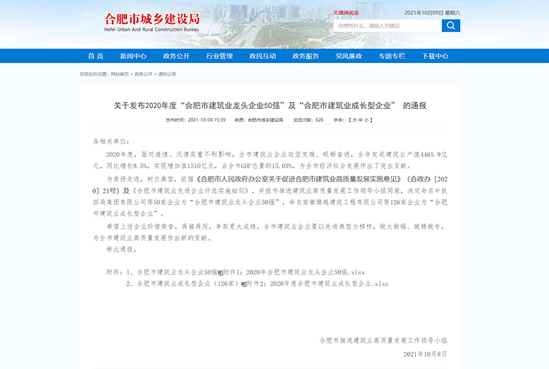 10月8日,合肥市城乡建设局网站发布2020年度“合肥市建筑业龙头企业50强”的通报,安徽新建控股集团荣获2020合肥建筑业龙头企业第29名。