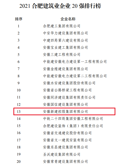 会上发布了2021合肥企业50强、2021合肥制造业企业30强、2021合肥服务业企业20强、2021合肥建筑业企业20强以及2021合肥农业企业20强榜单。安徽新建控股集团位居2021合肥建筑业企业20强第13位。