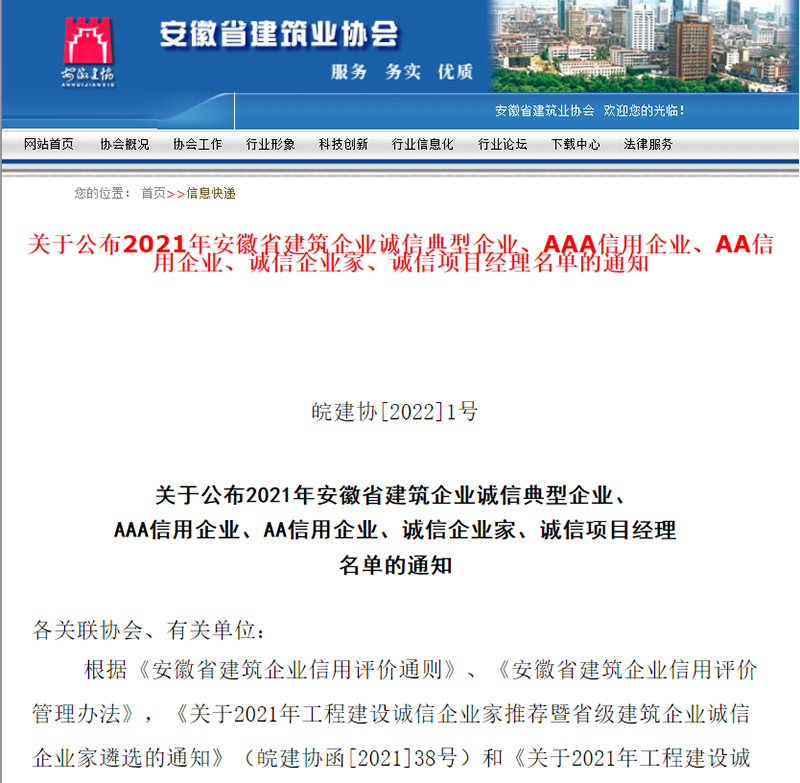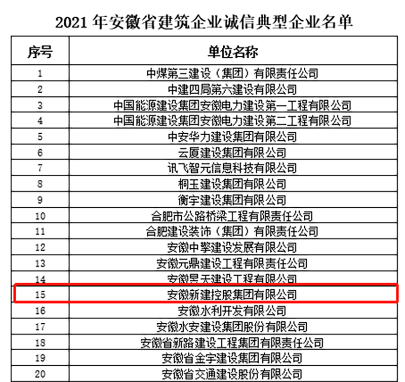 1月5日,安徽省建筑业协会分别公布了2021年安徽省建筑企业诚信典型企业、AAA信用企业评价结果,安徽新建控股集团凭借卓越的服务质量、品牌认知度和良好的社会信誉获评“安徽省建筑企业诚信典型企业”和“AAA信用企业”两项殊荣。