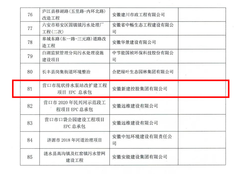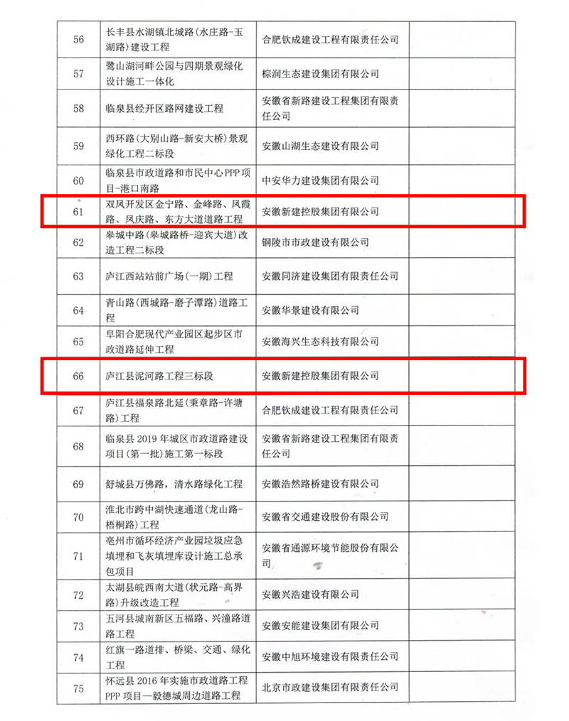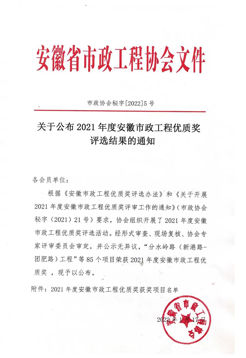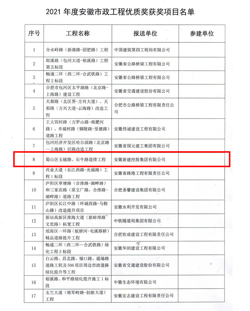 2022年1月17日,安徽省市政工程协会公布了2021年度安徽省市政工程优质奖评选结果的通知,经形式审查、现场复核、协会专家评审委员会审定,并公示无异议,安徽新建控股集团有限公司承建的四项工程荣获“2020年度安徽省市政工程优质奖”!