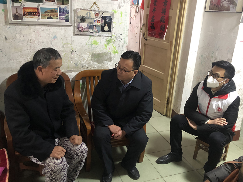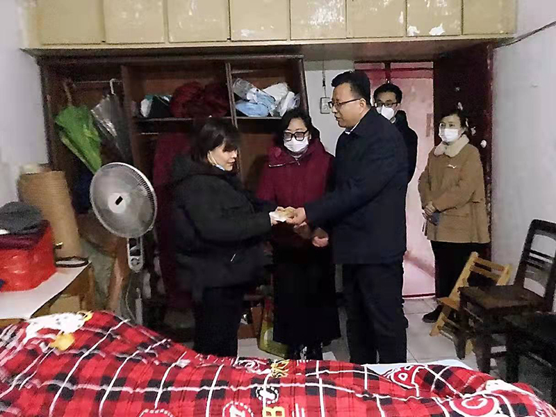 在街道和社区有关部门前期摸底的基础上,当日公司领导在社区有关领导的陪同下,先后到童某、刘某、欧阳某、王某和靳某家,每到一户,都在为困难群众送上慰问品和祝福的同时,关心询问他们的健康状况、生活情况,认真聆听有何困难和需求。最后在靳某家慰问时,针对靳某大病多年瘫痪在床,去年病情加重住进重症监护室,经抢救脱离危险后直至年底才出院,靳某的妻子在12月底又因意外胳膊摔伤,导致家中雪上加霜的情况,公司领导为靳某送上5000元的节日慰问金,另外有5000元的医疗补助费由公司委托包公街道“人在暖途”困境家庭救助服务机构于春节后发放给靳某。
