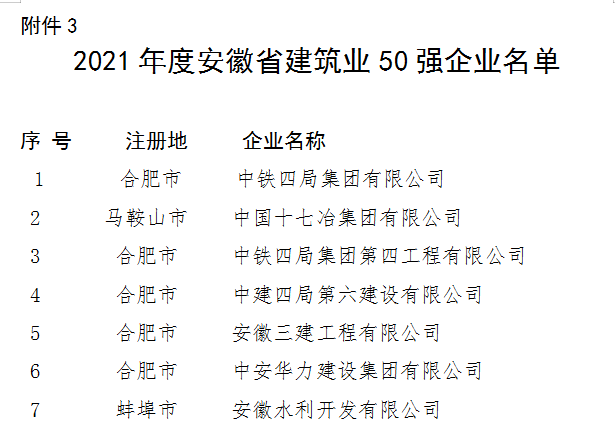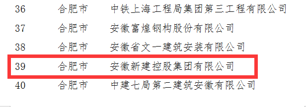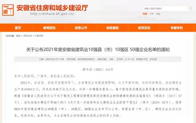 二月瑞雪兆丰年,金虎啸春启新程。2月10日,安徽省住房和城乡建设厅公布了2021年度安徽省建筑业10强县(市)、10强区、50强企业名单,安徽新建控股集团荣登我省建筑业50强,并名列第39位。