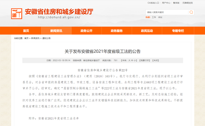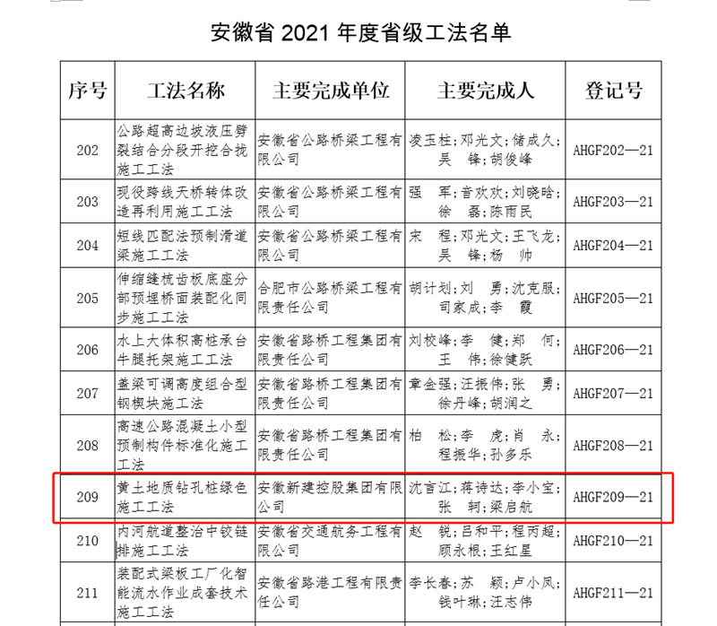 3月18日,安徽省住房和城乡建设厅发布公告,按照《安徽省工程建设工法管理办法》,经省级工法评审委员会审定,新建集团申报的一项“黄土地质钻孔桩绿色施工工法AHGF209—21”成功获得安徽省2021年度省级工法认证。