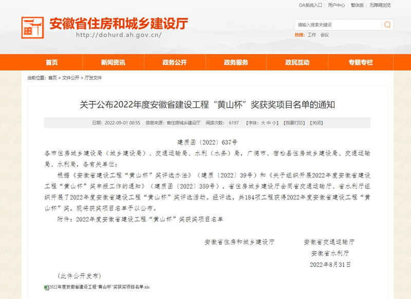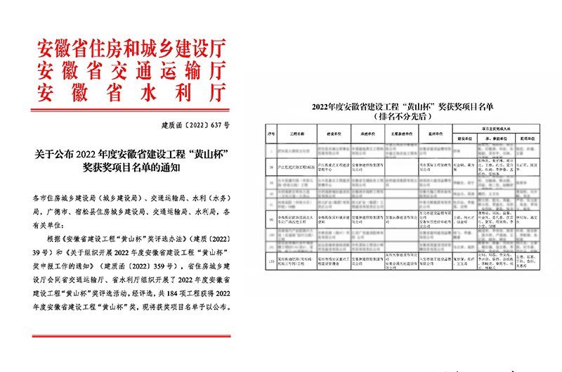 “黄山杯”奖为安徽省建设工程质量的最高奖,由省住房城乡建设厅、省交通运输厅、省水利厅联合颁发,每年评选一次,在提高全省工程质量水平上发挥示范引领作用。公司在承建项目之初,就将“精品工程”作为工程目标进行实施,并积极创优,从策划、实施、总结提炼全过程进行控制,并提出了按质按量完成各项施工任务。施工过程中,项目部按照制定的施工组织方案,对各项工序严格把关,各项技术指标进行严格控制,保证了施工质量。