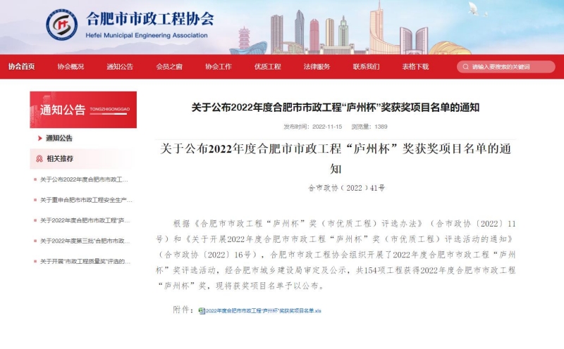 11月15日,合肥市市政工程协会网站发布《关于公布2022年度合肥市市政工程“庐州杯”奖获奖项目名单的通知》,安徽新建承建三项市政工程喜获2022年度合肥市市政工程“庐州杯”奖。