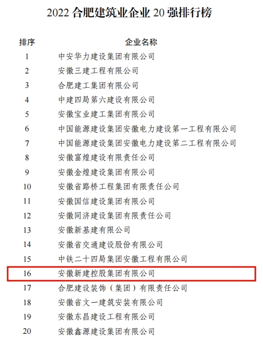 2022年12月8日,合肥市企业(企业家)联合会颁布合肥建筑业企业20强榜单(排序以2021年度营业收入为准),安徽新建控股集团再次榜上有名,荣登2022合肥建筑业企业20强排行榜第16位。