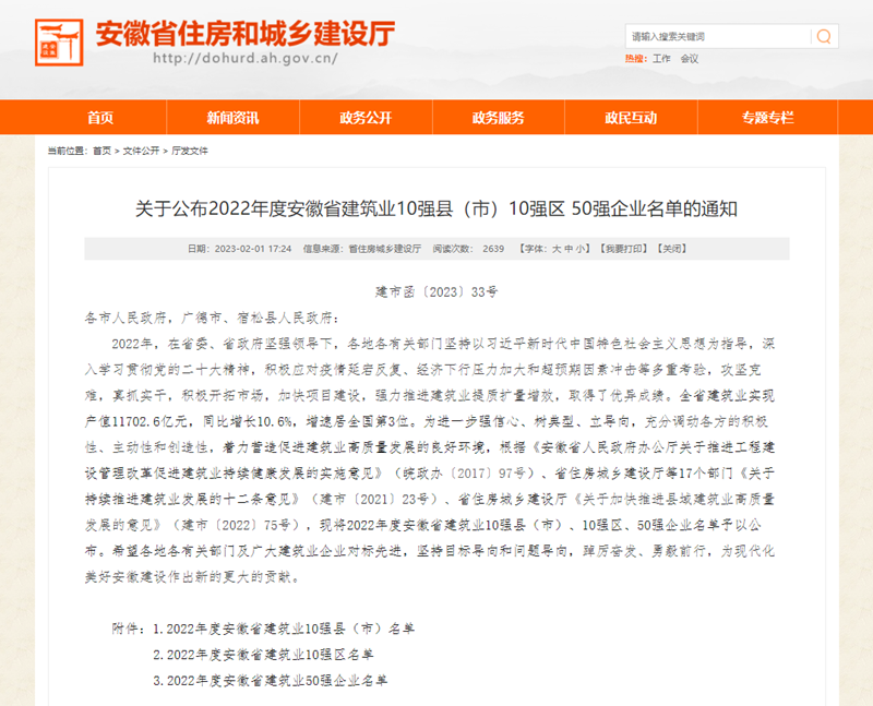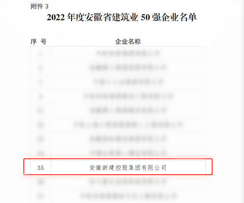 近日,安徽省住建厅公布了2022年度安徽省建筑业50强企业名单,安徽新建控股集团凭借深厚的综合实力再次荣登安徽省建筑业50强榜单,排序第35位。
