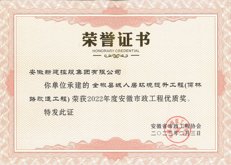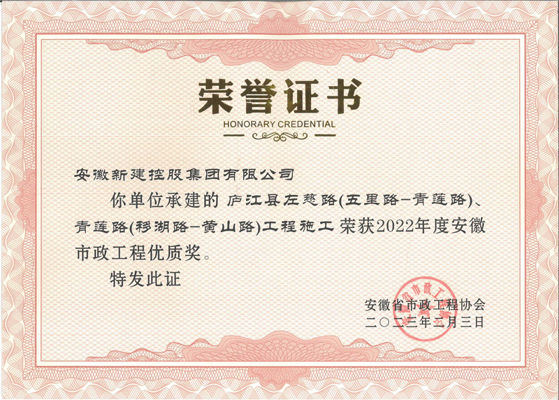 日前,安徽省市政工程协会颁发了2022年度安徽市政工程优质奖获奖项目荣誉证书,集团公司承建的庐江县左慈路青莲路工程、全椒县城人居环境提升工程两项项目均获市政工程优质奖。