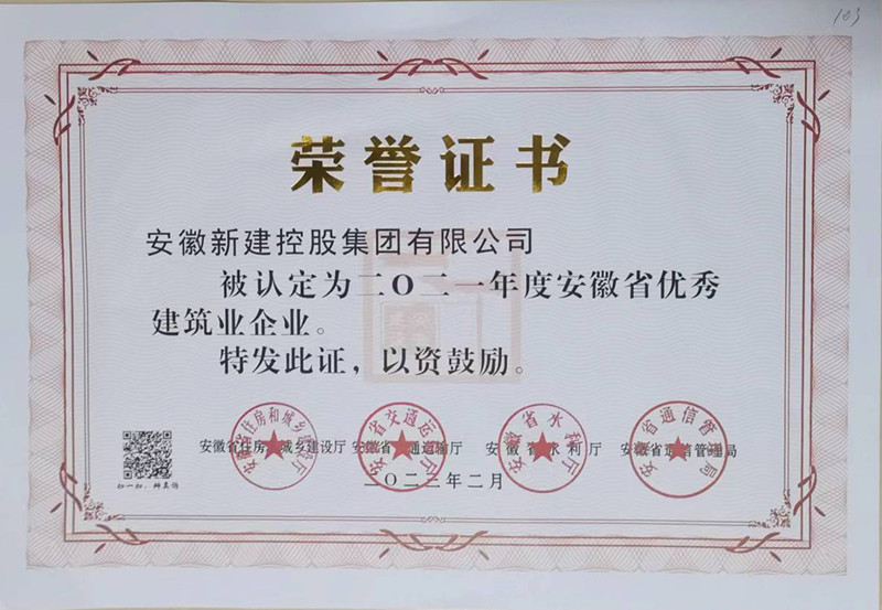 近日,安徽省住房和城乡建设厅颁发了“2021年度安徽省优秀建筑业企业”奖牌及证书,安徽新建控股集团有限公司荣列榜单。