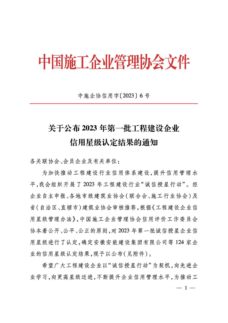 3月17日,中国施工企业管理协会公布2023年度第一批工程建设企业星级认定结果,在全国第一批参加认定的124家企业中,安徽新建凭借良好的企业履约行为和信用表现,获得信用星级九星认定。