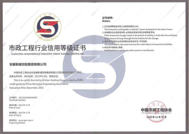 近日,中国市政工程协会颁发2022年度首批市政工程企业信用评价等级证书,安徽新建荣获“AAA”等级。