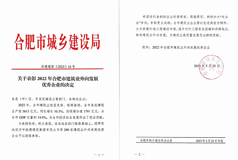 为表扬先进,树立典型,5月22日,合肥市城乡建设局发布《关于表彰2022年合肥市建筑业外向发展优秀企业的决定》。安徽新建获得“2022年合肥市建筑业外向发展优秀企业”称号。