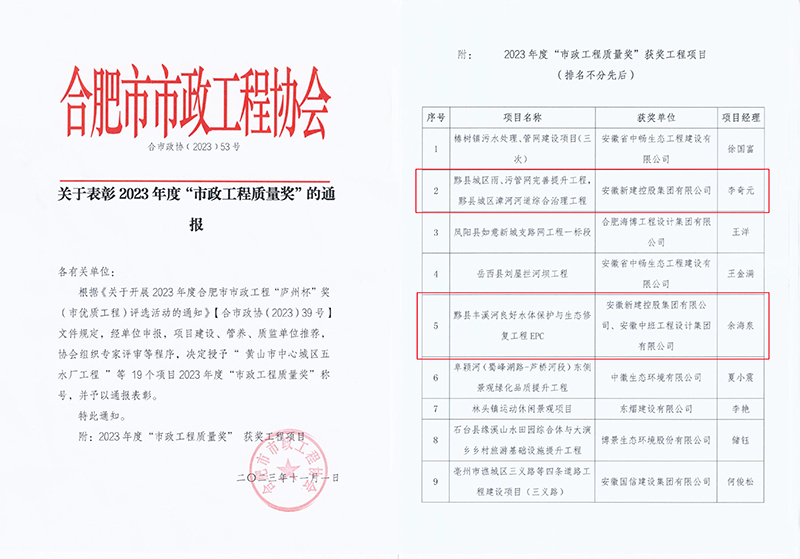 近日,合肥市市政工程协会发布《关于表彰2023年度“市政工程质量奖”的通知》,决定授予19个项目2023年度“市政工程质量奖”称号并通报表彰,其中集团公司承建的“黟县城区雨、污管网完善提升工程,黟县城区漳河河道综合治理工程”、“黟县丰溪河良好水体保护与生态修复工程EPC”项目荣登榜单。