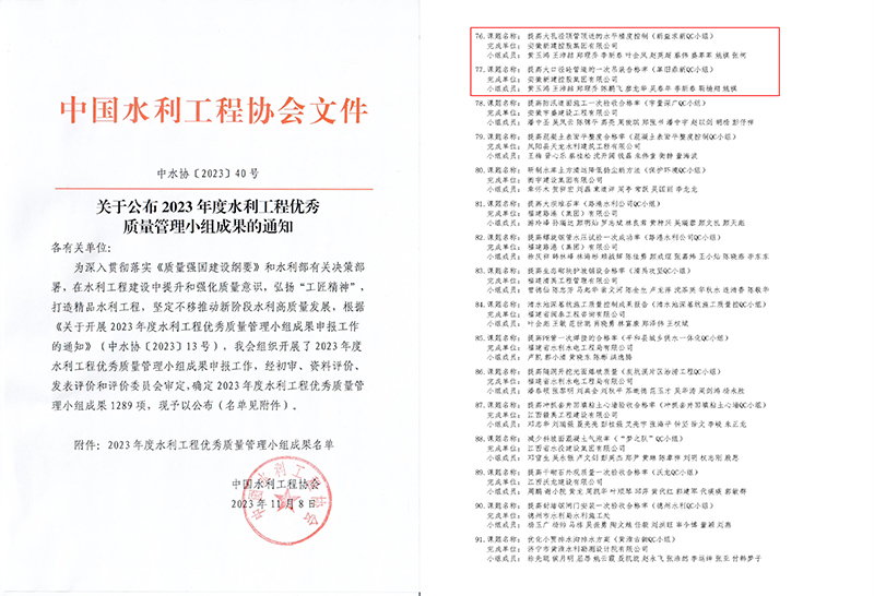 近日,中国水利工程协会在福州举行2023年度水利工程优秀质量管理小组活动成果发布会,经过激烈角逐,集团公司新益求新QC小组《提高大孔径顶管顶进的水平精度控制》和革旧鼎新QC小组《提高大口径碎管道的一次吊装合格率》2项课题成果入围,喜获Ⅲ类成果奖。