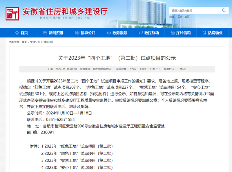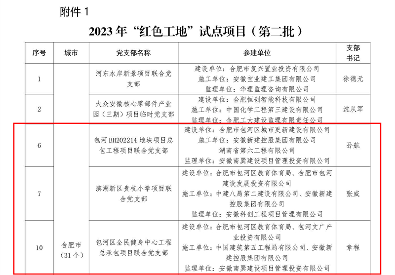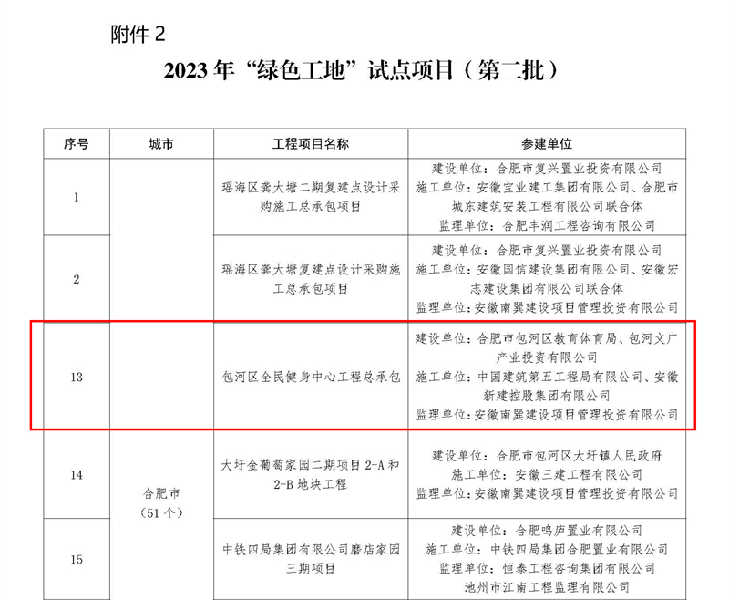 近日,安徽省住房和城乡建设厅网站公布了2023年“四个工地”(第二批)试点项目的名单,集团公司承建项目滨湖新区贵杭小学、包河区全民健身中心工程总承包、包河BH202214地块项目总包工程获得“红色工地”试点称号,其中包河区全民健身中心工程总承包同时获评“绿色工地”称号。