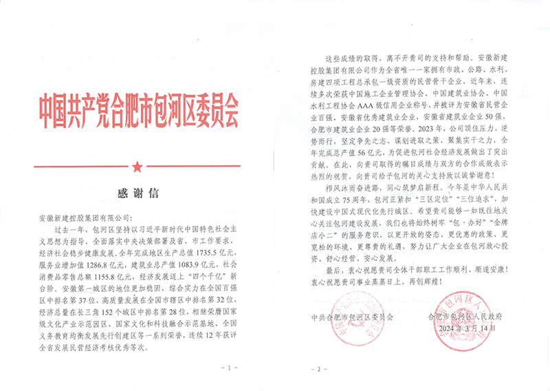 近日,安徽新建收到包河区委区政府发来的一封感谢信,对集团公司2023年取得的瞩目成绩与双方的合作成效以及公司对包河的关心支持致以诚挚谢意!