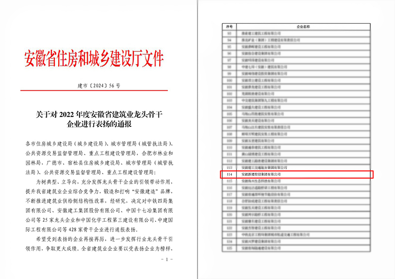近日,在安徽省住房城乡建设厅召开的全省建筑业发展工作推进会上,安徽新建控股集团有限公司被安徽省住房和城乡建设厅、安徽省交通运输厅、安徽省水利厅、安徽省通信管理局联合表彰为“2022年度安徽省建筑业骨干企业”,并再次荣获“安徽省优秀建筑业企业”称号!