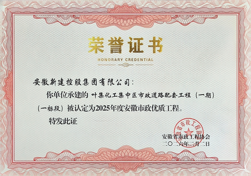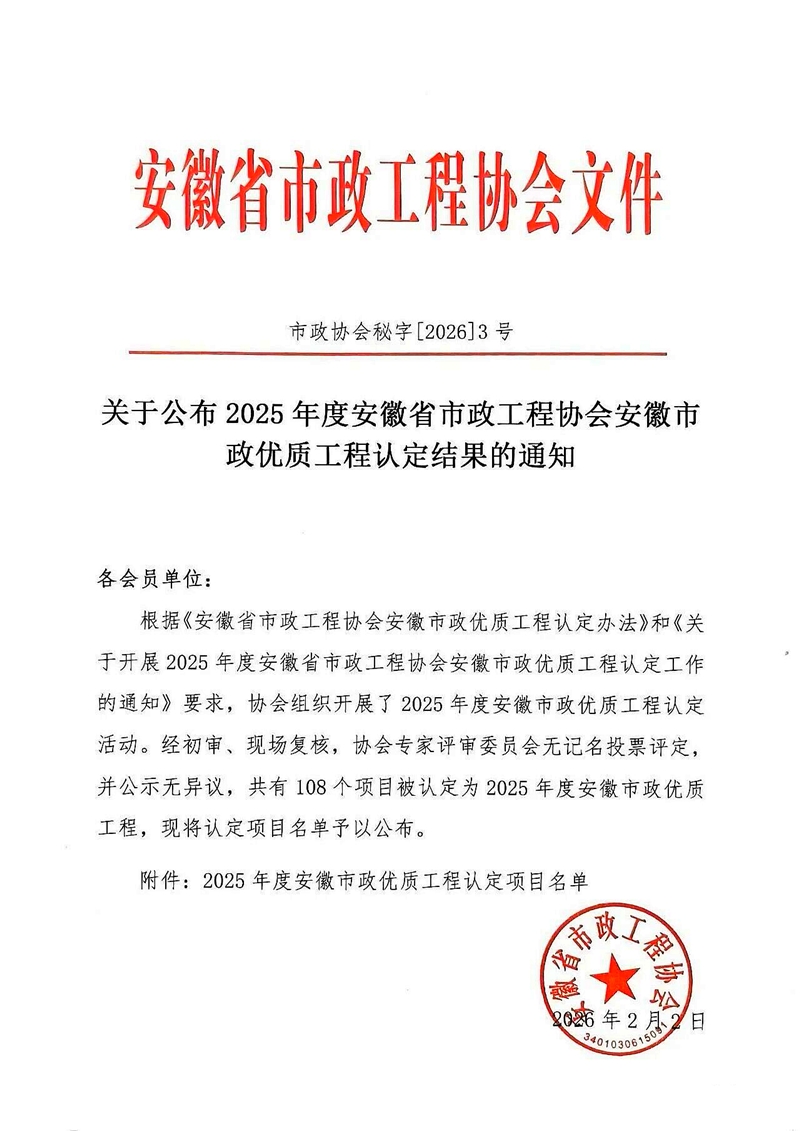 2月2日,安徽省市政工程协会公布2025年度安徽市政优质工程项目名单,集团公司承建的四项工程荣获奖项,分别是:六安市叶集区姚李镇光华大街道路改造工程、全椒县城市更新和补短板项目、叶集化工集中区市政道路配套工程、无为市经二路工程。