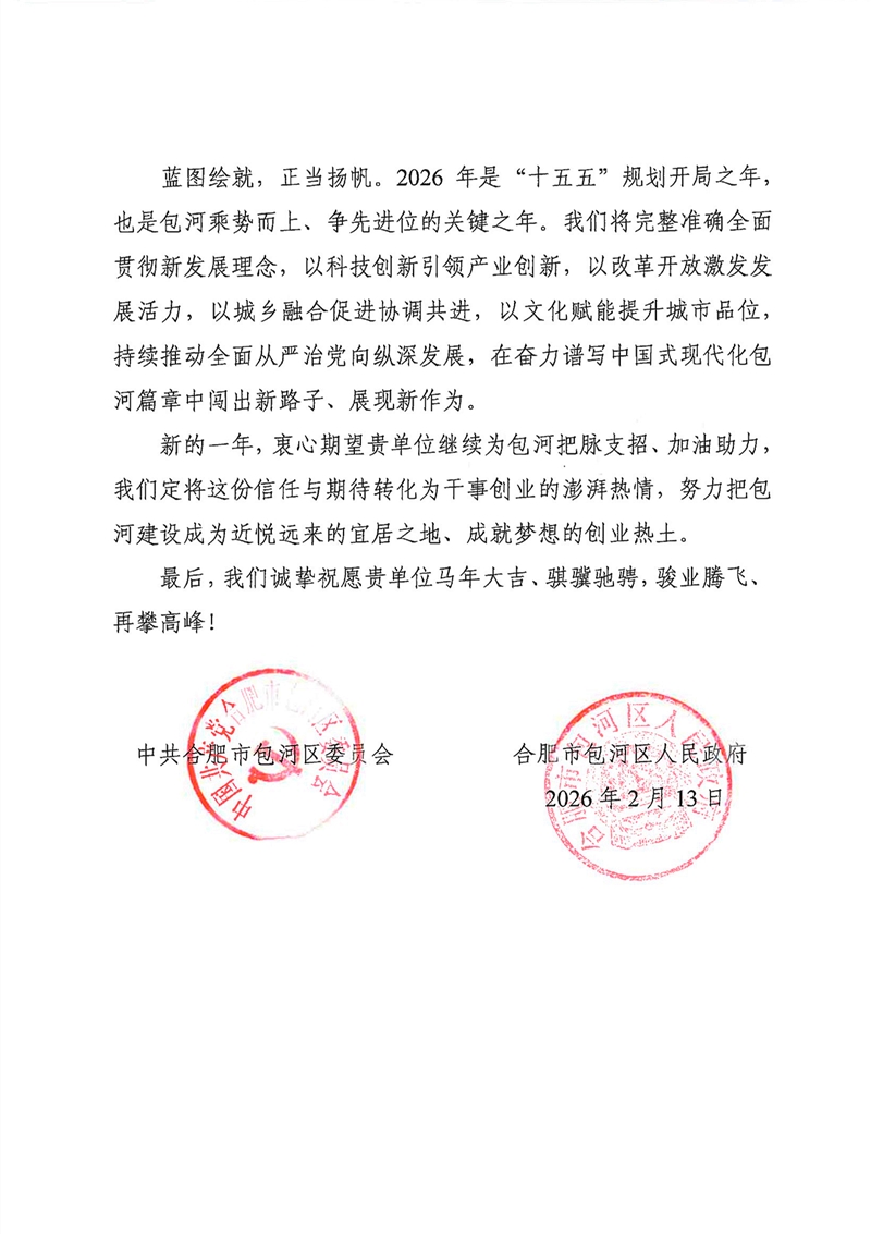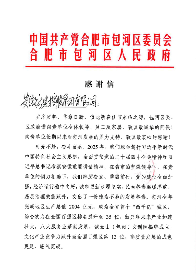 近日,安徽新建控股集团收到合肥市包河区委、区政府新春感谢信,信中致谢公司对包河发展的鼎力支持,并致以新春祝福。2025年包河成为全省首个“两千亿”城区,全国百强区排名升至35位,发展成果离不开公司助力。2026年作为“十五五”开局之年,包河期待公司继续赋能发展。集团公司将不负信任,深耕包河、主动作为,与包河同频共振,共推高质量发展再上新台阶,携手绘就发展新图景。