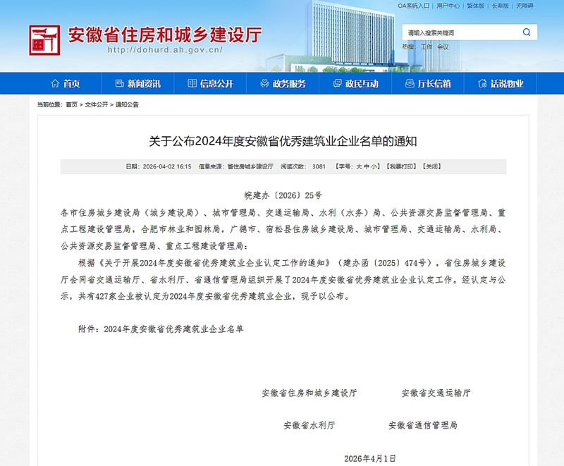 近日,安徽省住房和城乡建设厅、省交通运输厅、省水利厅、省通信管理局联合公布2024年度安徽省优秀建筑业企业认定结果,其中,新建集团凭借非凡实力,连续五年荣登榜单,并获评“综合基础设施总承包类龙头企业”称号!