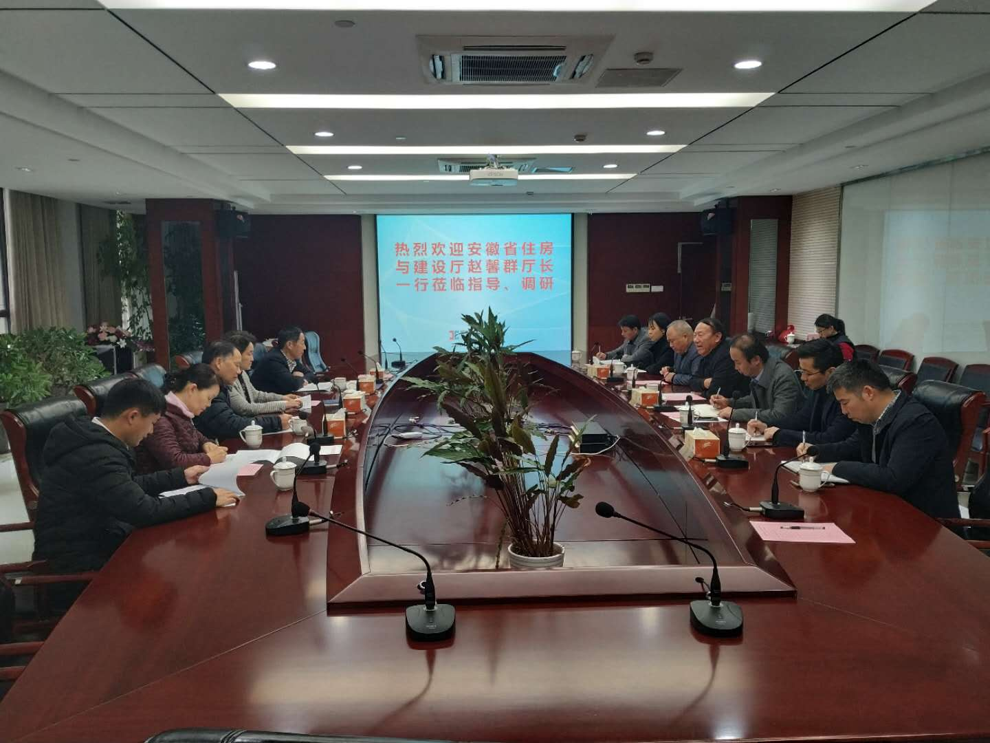 2018年12月26日下午,省住建厅赵馨群厅长一行赴我公司开展“四送一服”进民企活动调研工作。安徽新建控股集团有限公司董事长王杰英、总经理王鹏程等全程陪同。