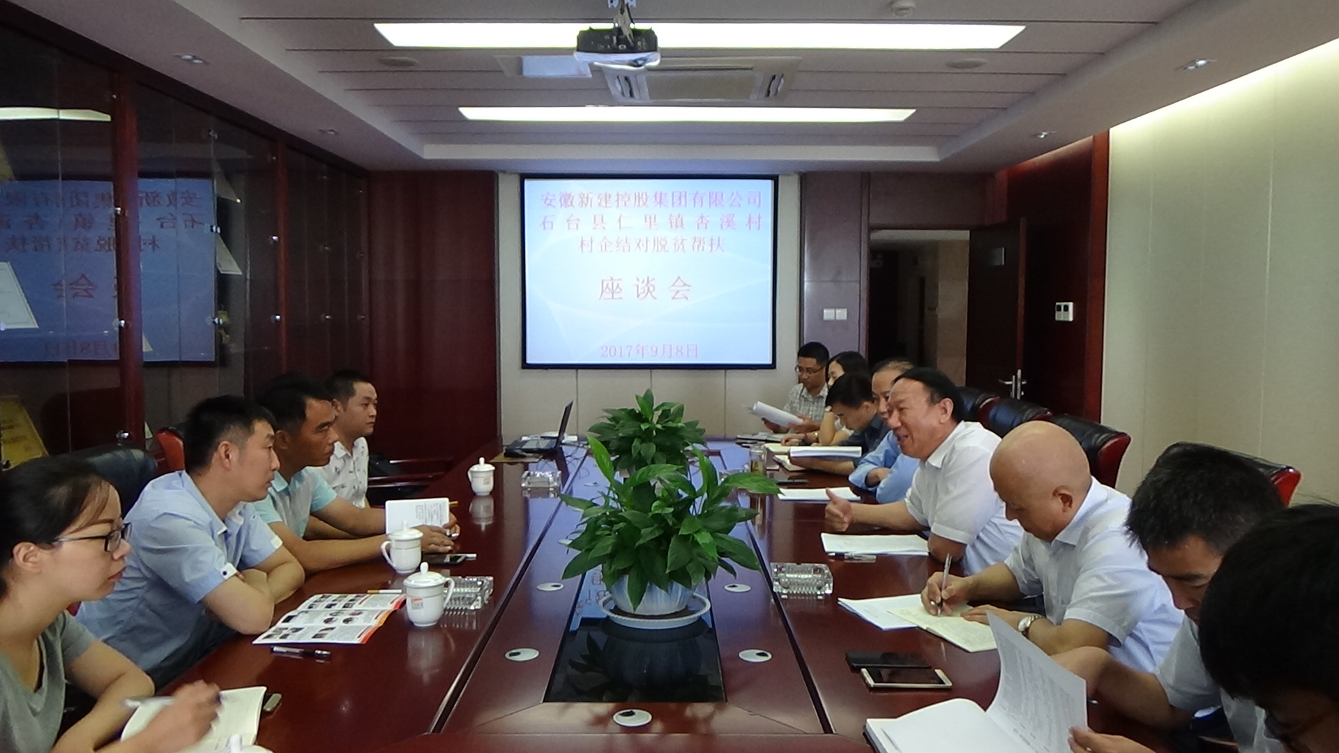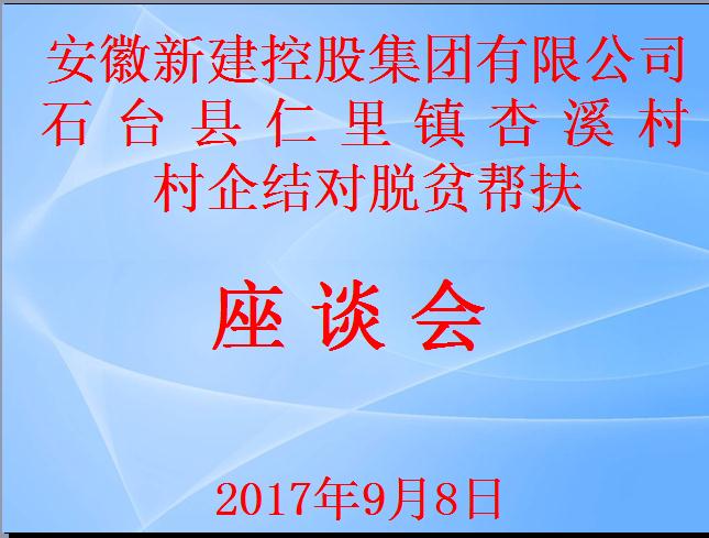 2017年9月8日,我公司村企结对脱贫帮扶对象石台县仁里镇杏溪村的村委书记雷霆一行来我公司座谈,安徽新建控股集团有限公司董事长王杰英等相关领导参加了座谈会,雷书记对杏溪村的脱贫情况进行了详细介绍,公司领导对杏溪村脱贫帮扶给出了初步计划和方案,村企双方对座谈效果感到满意。