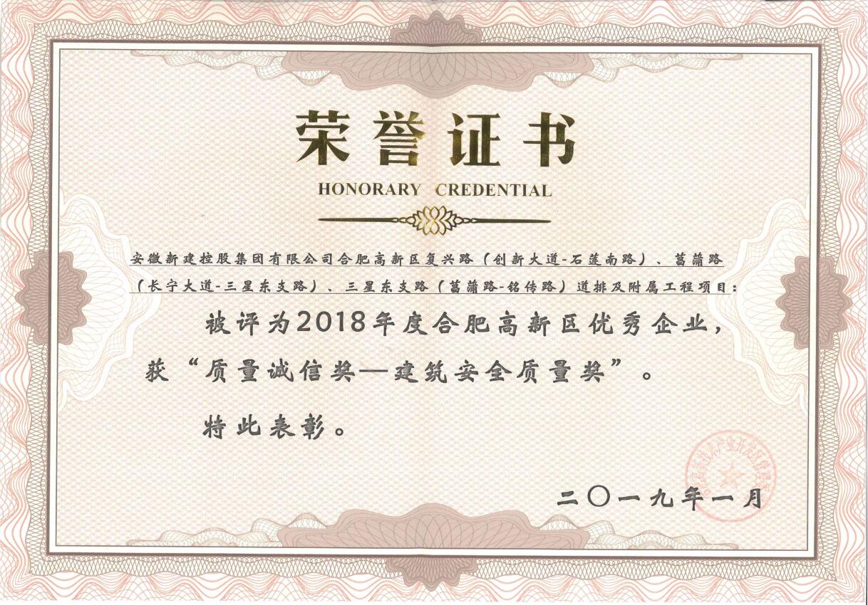喜报,由我公司承建的合肥高新区复兴路(石莲南路-创新大道)、菖蒲路(长宁大道-三星东支路)、三星东支路(菖蒲路-铭传路)道排及附属工程荣获“质量诚信奖——建筑安全质量奖”,同时,我公司被评为2018年度合肥高新区优秀企业。这是本项目继“庐州杯”和“合肥市市政工程安全文明标准化示范工地”之后获得的又一殊荣。