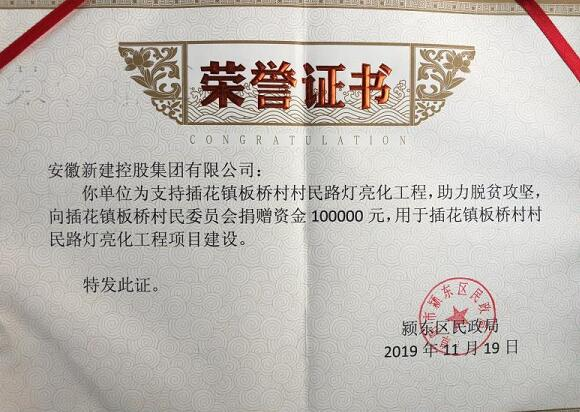 近日,阜阳市颍东区民政局为我公司颁发了扶贫荣誉证书,以感谢我公司在为”阜阳市颍东区插花镇板桥村村民路灯亮化工程”的扶贫项目中慷慨解囊、情系精准扶贫的善举。