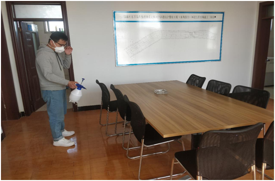 为做好疫情防控与项目的复工复产,我公司河北邯郸支漳河综合整治工程二标段项目部在复工前,成立疫情防控小组,备足消毒液、洗手液、喷雾器以及口罩等防疫物资,每天安排专人对办公区、宿舍生活区等进行消毒清理工作。